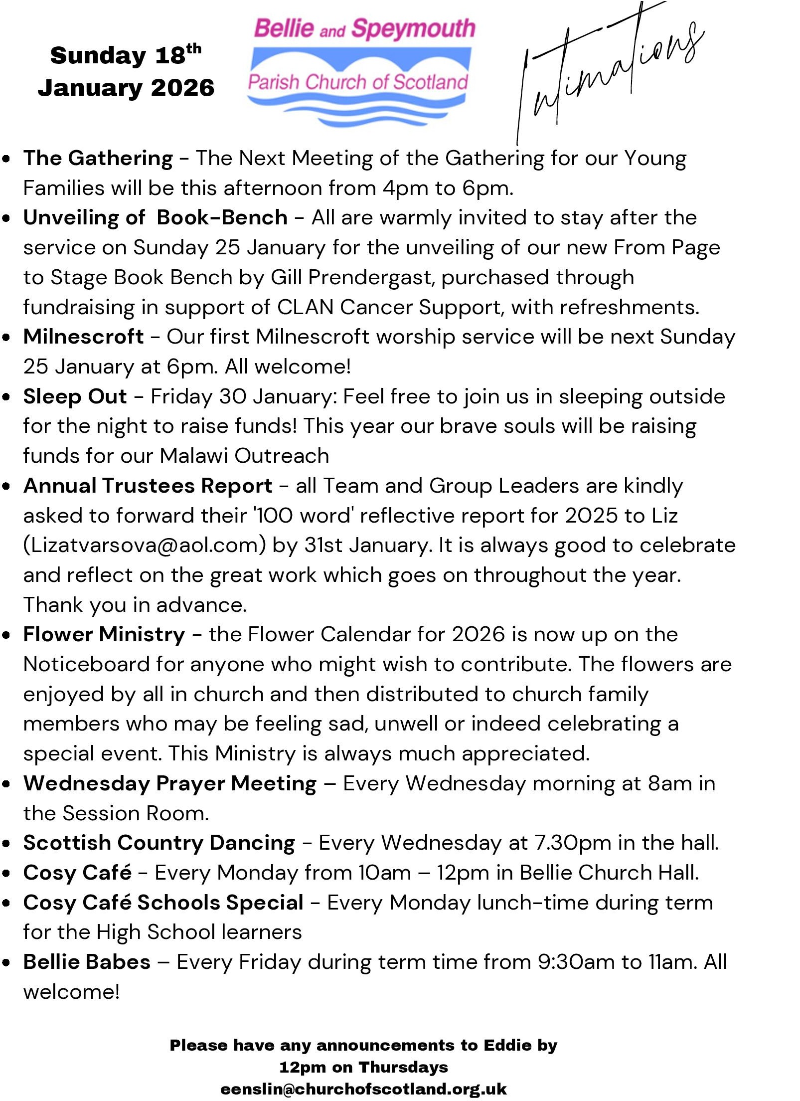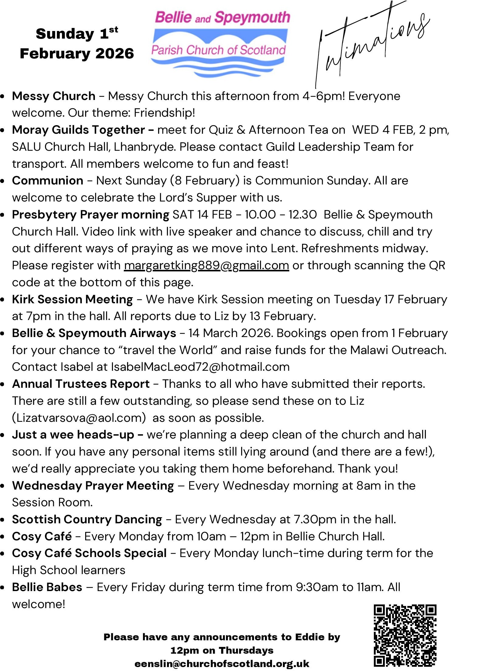 Bellie Church Hall - after conclusion of All Age Talk at 10.30 am service in Bellie Church