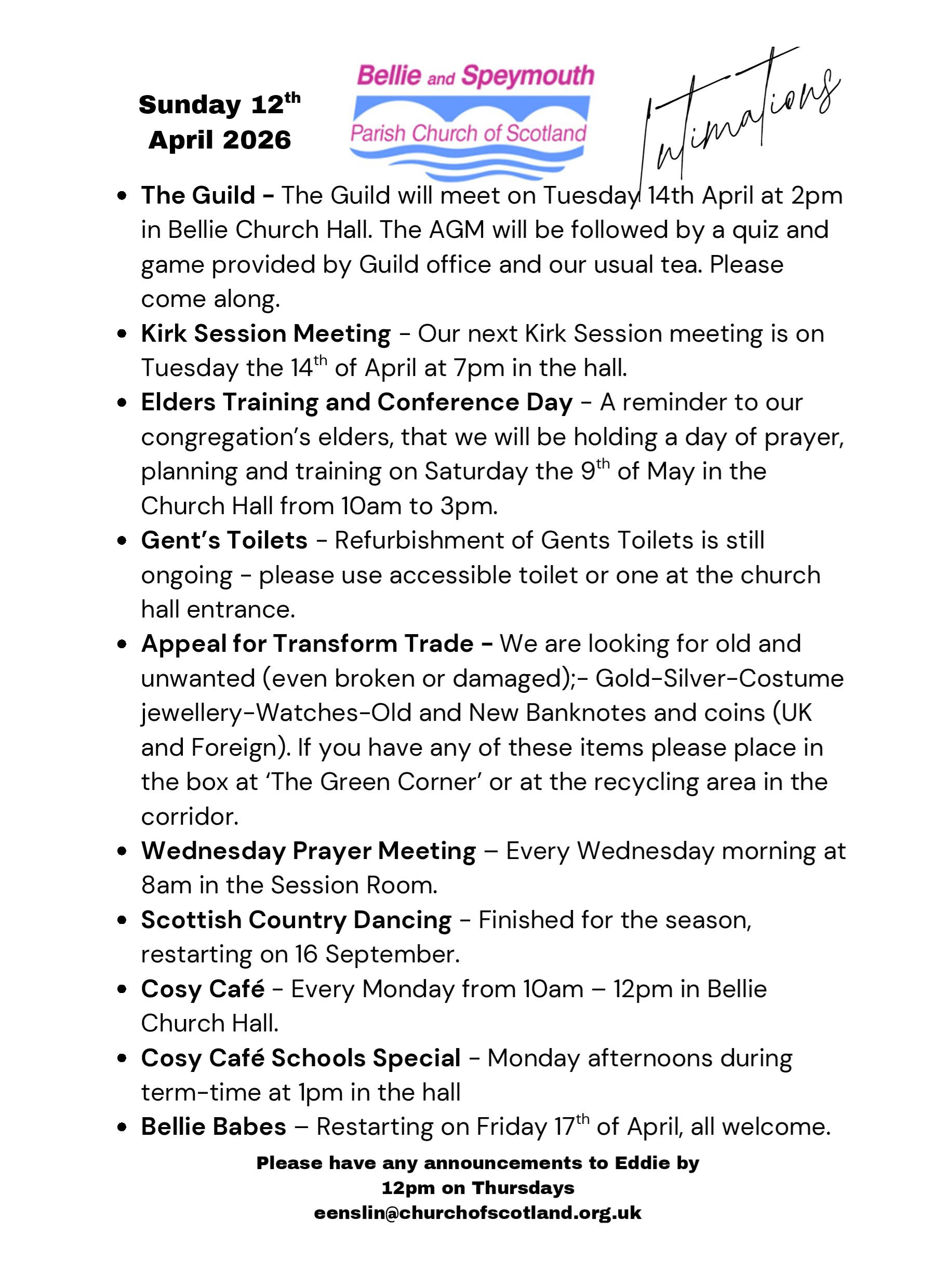 Bellie Church Hall - after conclusion of All Age Talk at 10.30 am service in Bellie Church